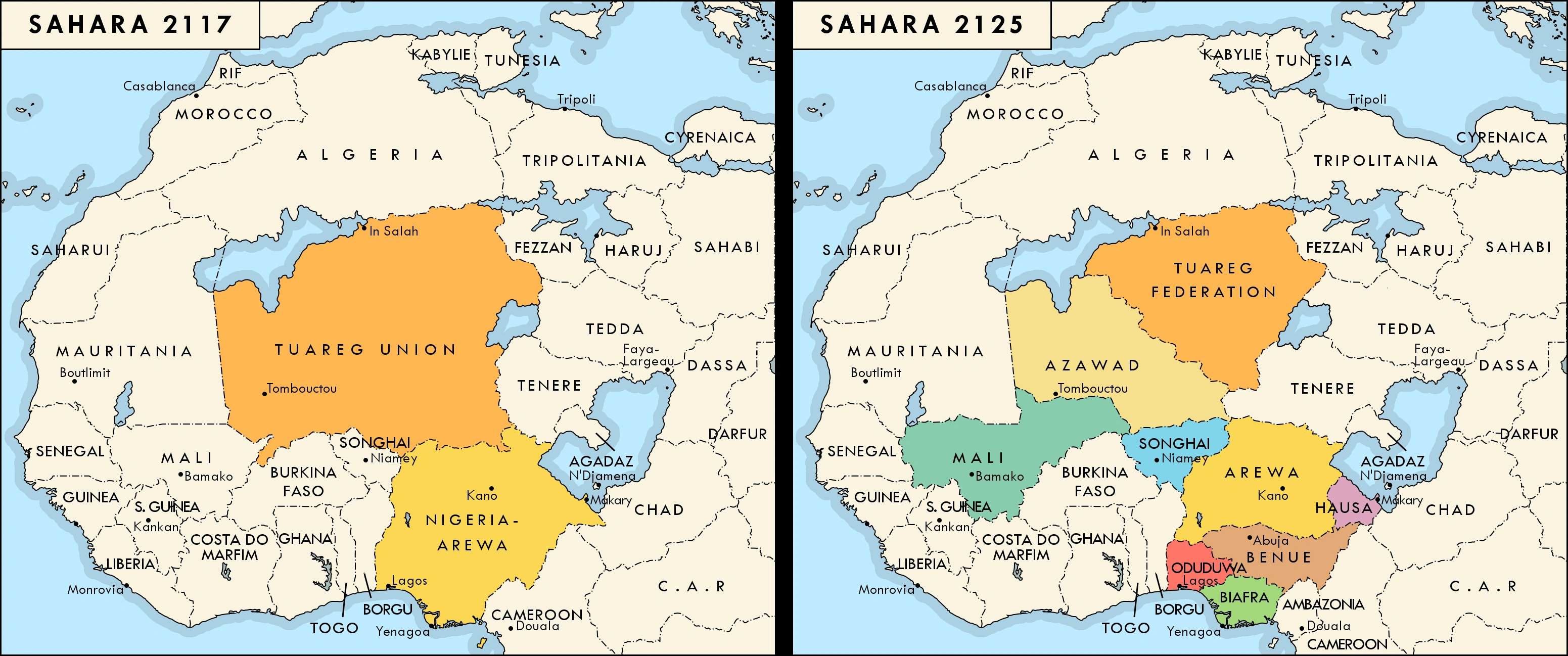 The Breakup of the Mediterranean Union created a power vacuum in the Sahara, a vacuum that the Tuareg Union and the newly reunified Nigera hoped to fill. The reunification of Nigeria and Arewa was a political coup executed by American diplomats when the wars in East Africa had only just begun. The hope was for Nigeria to be the base of power in West Africa, and to create the means for a Nigerian-Congolese-East African bloc that could secure US space elevator access in the region, along with all major trade routs to get those goods to market. For Mexico, this was unacceptable. It didn't take any prodding to get the Tuareg Union on board to oppose the Nigerians, and for close to a decade their forces stood at odds on a common border.