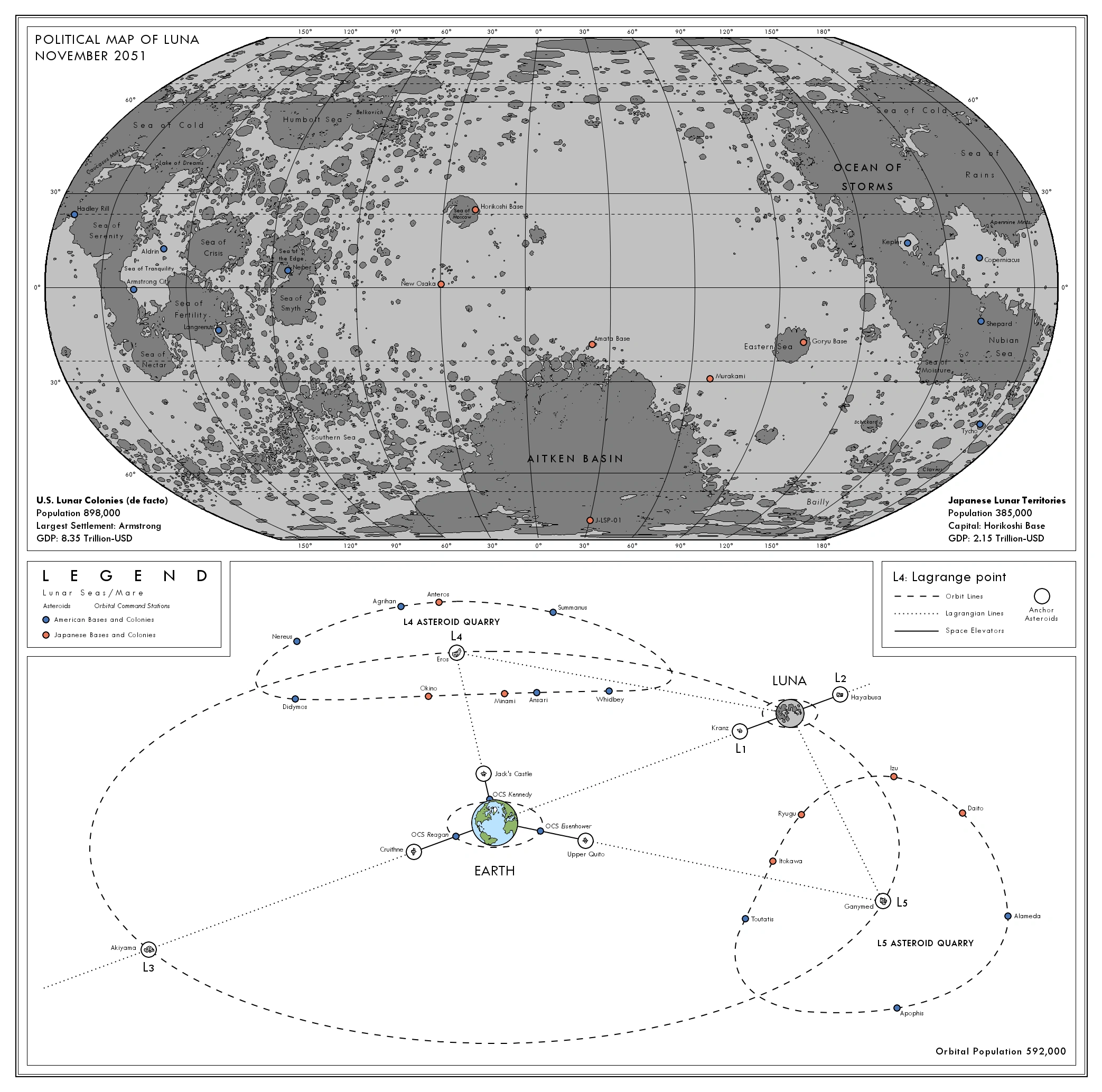 While both the US and Japan held relatively equal sway over Cislunar space, the Moon was increasingly seen as being dominated by the United States. American Lunar colonies were home to 70% of the lunar population, controlled 83% of all water-ice reserves, and the Tycho shipyards that birthed the Orbital Command Stations serviced the creation of fleets of ships, both civilian and military. Meanwhile, Japan's bases were predominantly military or research in nature, and were positioned on the Far Side of the Moon. American dominance of the Moon was largely responsible for continued American dominance in Space. The Asteroids were too vulnerable to serve as bases for military operations (though Japan was certainly challenging that with their facilities on the Akiyama asteroid at L3), while the Moon was far more defensible and control of its Helium-3 industry allowed the US to field and fuel its Orbital Command Stations that surrounded the Earth and had been used to blockade Japan's sea and space assets to devastating effect.