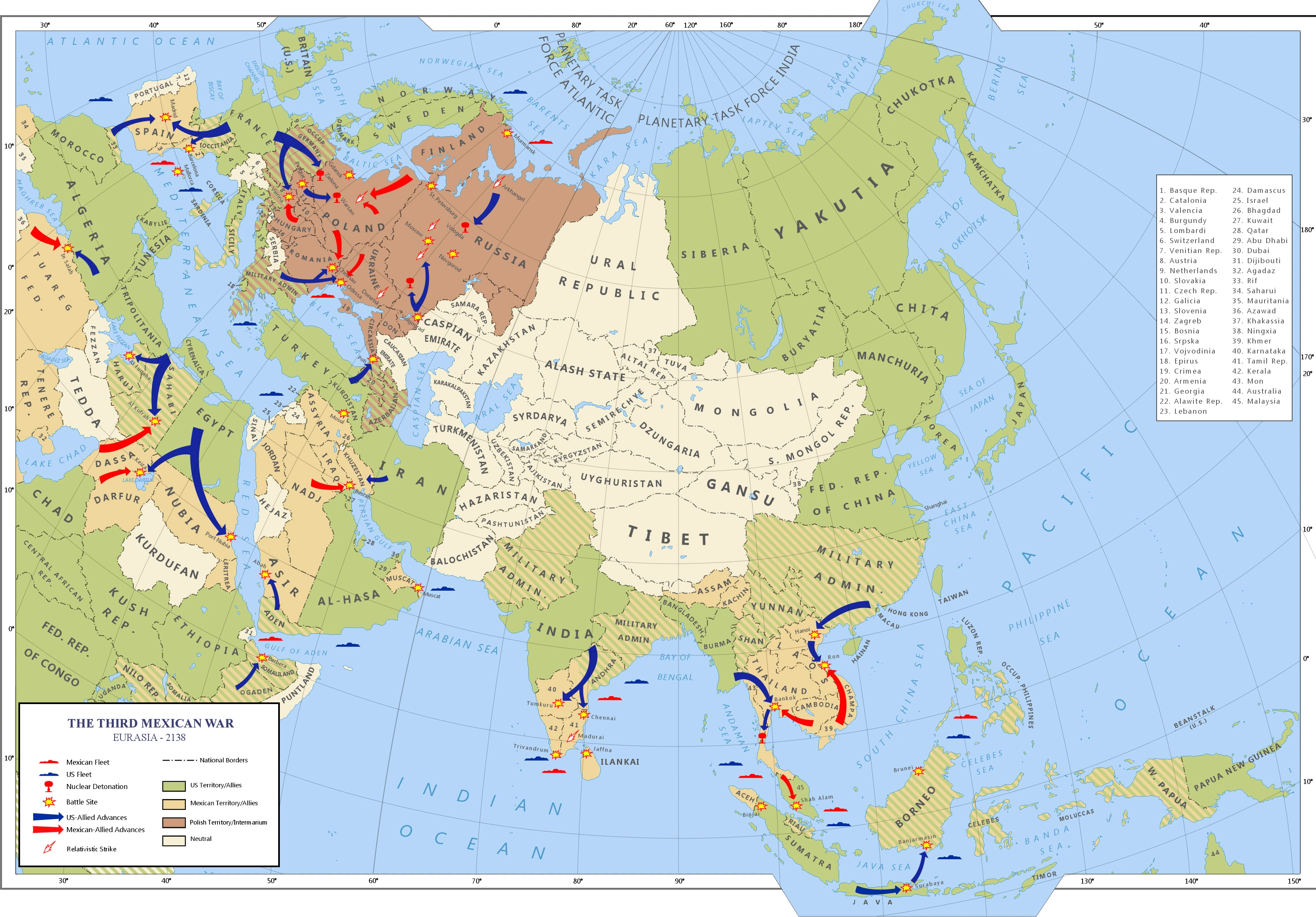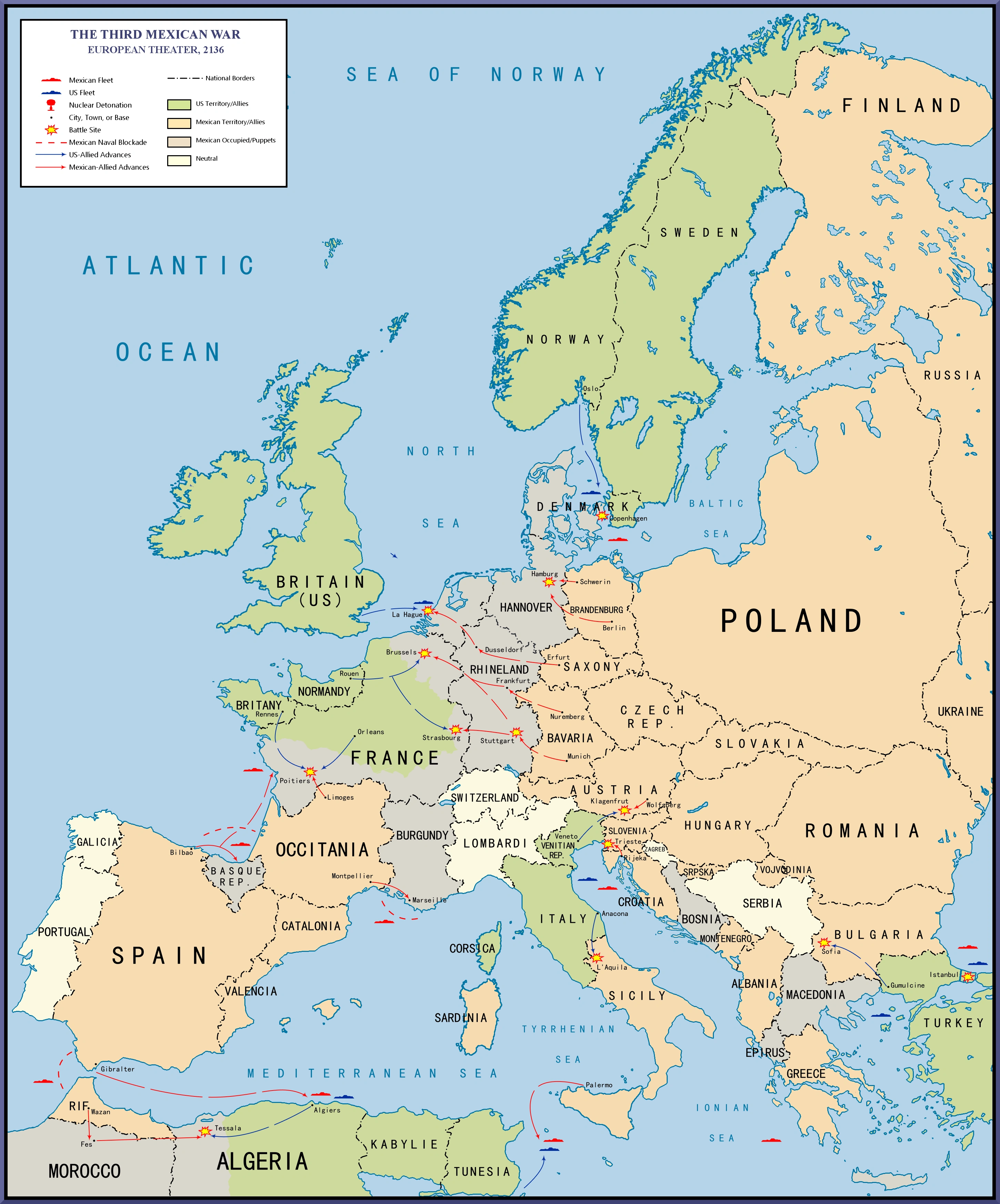 In a secret meeting in Athens on January 9, 2136, Mexico and Poland agreed to ally against the US, with Mexico guaranteeing Polish dominance over Northern Europe, and Poland agreeing to engage the US directly to limit any movement of potential American forces. On January 25, 2136 Poland entered the war with Mexico pulling the US into a protracted war across the planet. One week after the Athens Pact, Poland invaded through Brandenburg into Hanover and from Bavaria into Rhineland overwhelming US-Allied forces, and pushing them as far west as Lorraine. While American-Allied forces retreated into France, Mexican-Allied forces invaded north through Occitania into Southern France and Burgundy.