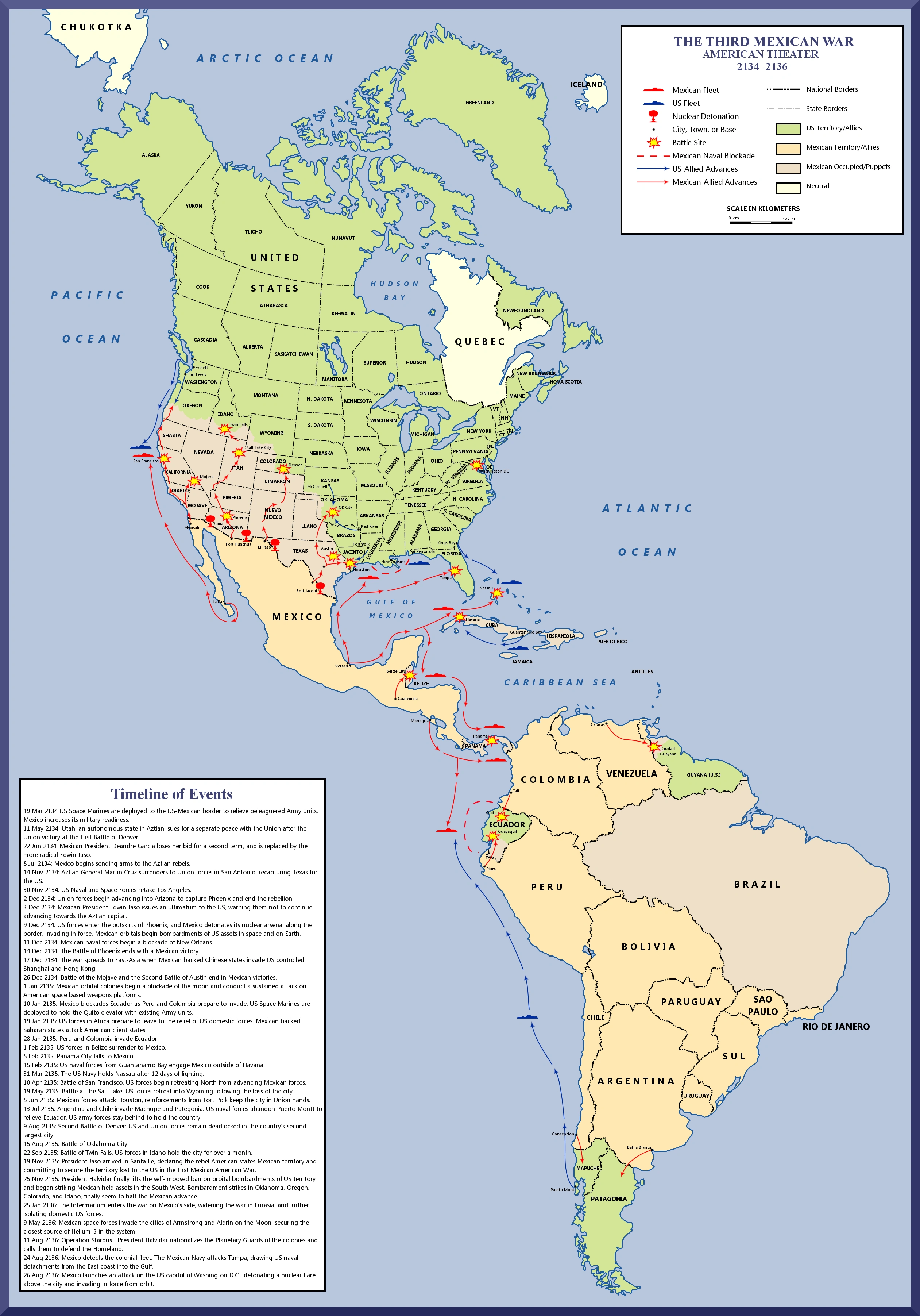 As has always been the case, Veracruz was seen as the key to victory in Mexico. Thus it should perhaps have been no surprise that Mexico was willing to destroy the port to rob the Union of a foothold that would take them the Capital. Mexico held nothing back against the Americans, detonating nuclear ordinance every step of the way to Mexico city, and where there were options in the North to withdraw and simply find a new rout, the road to Mexico City was far less flexible; the soldiers of the Veracruz campaign saw some of the heaviest losses of the war, a fact that was true for both sides. The Union responded with the largest bombardment campaign of the War, Operation Starlight, hitting three key military positions surrounding Mexico City. The ash cloud generated from Nuclear and Relativistic strikes blanketed the land and brought nuclear winter to the country. Millions of Mexican nationals poured over the border to flee from the fallout, but the fight in the Southwest hadn't left the region in much better shape. The war took a toll on the Earth that humans had not seen before. By the winter of 2138 the conditions in Mexico had become unbearable, the government was facing food shortages and uprisings across the country, but the Mexican military never yielded. The battle for the capital was a bloodbath, but the city was spared from nuclear or angel fire once the Union broke through the Mexican lines into the city center. President Jaso intended to fight till the last man, but was killed by his Secretary of Defense who promptly agreed to the American terms of surrender. The last battle in South America came to an end a few weeks later after the last holdouts in the Rio de La Plata finally agreed to surrender.