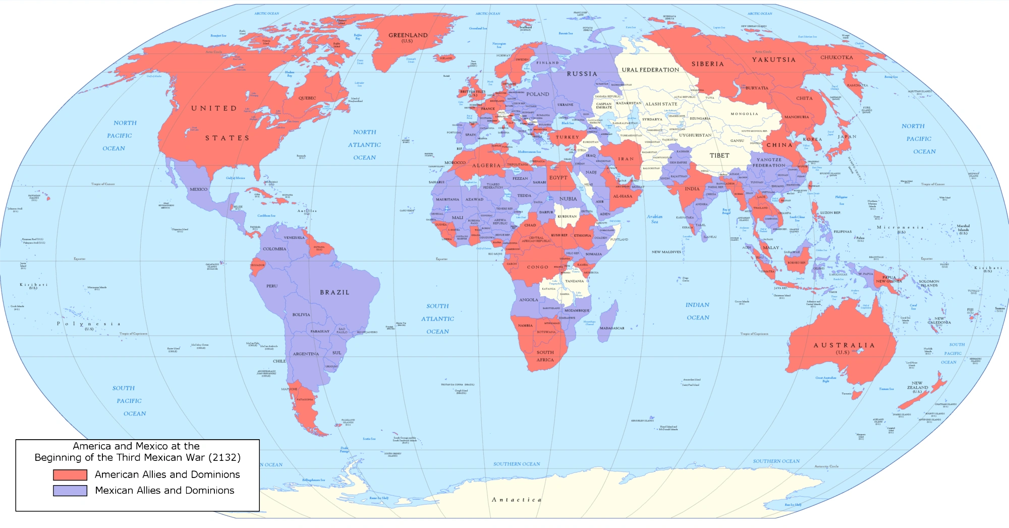 In 2129 Mexico staged a massive invasion of Brazil with its alliance structure, annexing neighboring territory, supporting secessionist movements, and installing a puppet government in Brasรญlia. The invasion gave Mexico access to the riches of the Amazon, and would keep Brazil largely out of the war once it started. Mexico maintained a contingent of "peace keepers" in Brazil well into 2134.