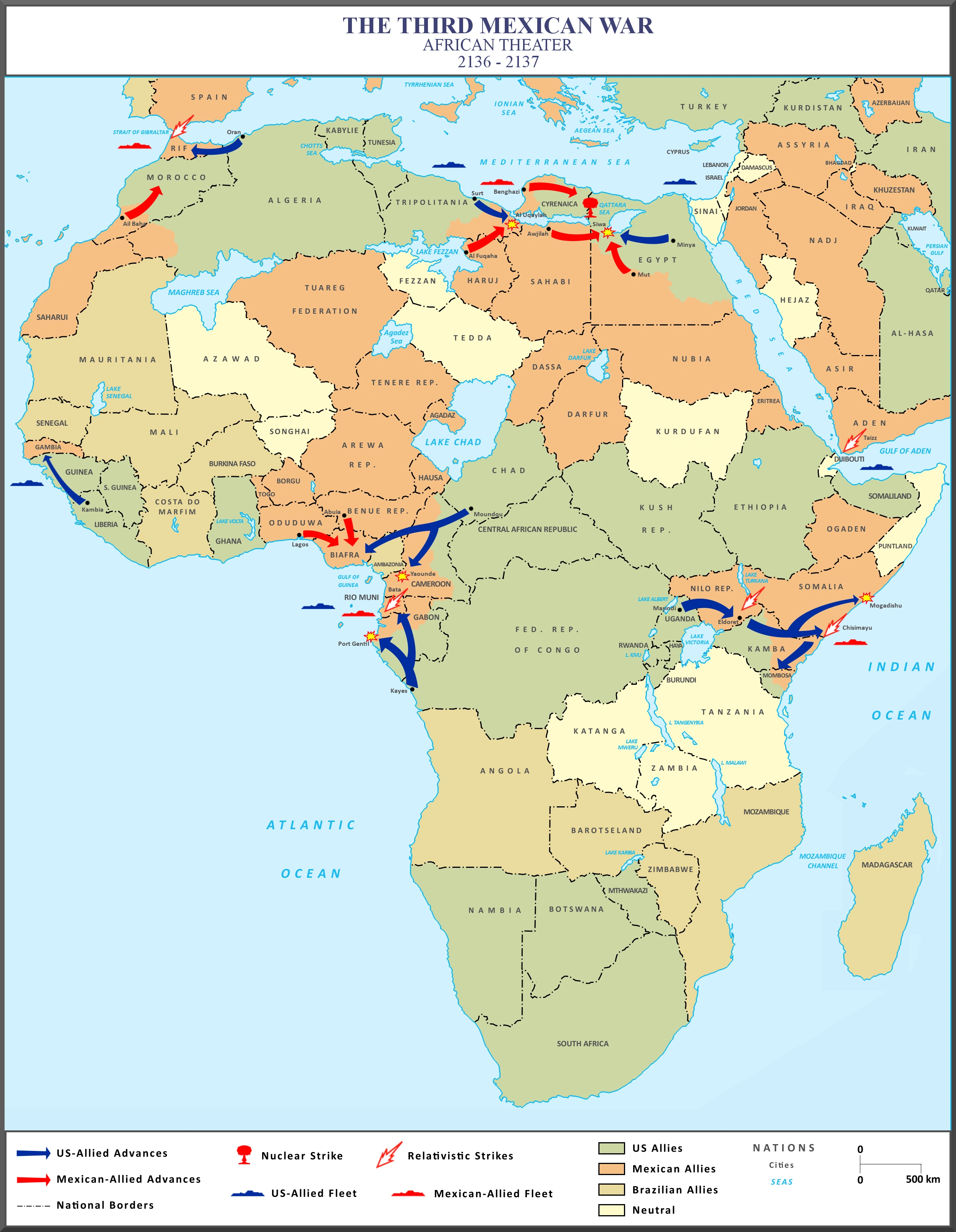 Africa saw comparatively little action for most of the war, with only the Mediterranean states engaging in open combat. The central Sahara was formally allied to Mexico, but in reality only the former Lybian states had directly engaged the American allies. Once the Second Wave of the colonial fleet arrived, the conflict in the Mediterranean was quickly put to rest after the Battle of Zawilah. After Zawilah, the colonials began moving south into the Saharan states, engaging local forces in two events before a separate peace was reached. The African front continued in Nigeria and East Africa where the ongoing wars between Mexican and American client states had been at a stalemate for years before the Third Mex-Am war broke out. The colonials dedicated more forces to East Africa than any single campaign in Europe in 2136 after Task Force India arrived. After landing the bulk of their forces in Uganda, the colonials would spend the rest of the year fighting to secure the region surrounding the Uganda Space Elevator, firing relativistic strikes just outside of Kismayo and Lodwar.