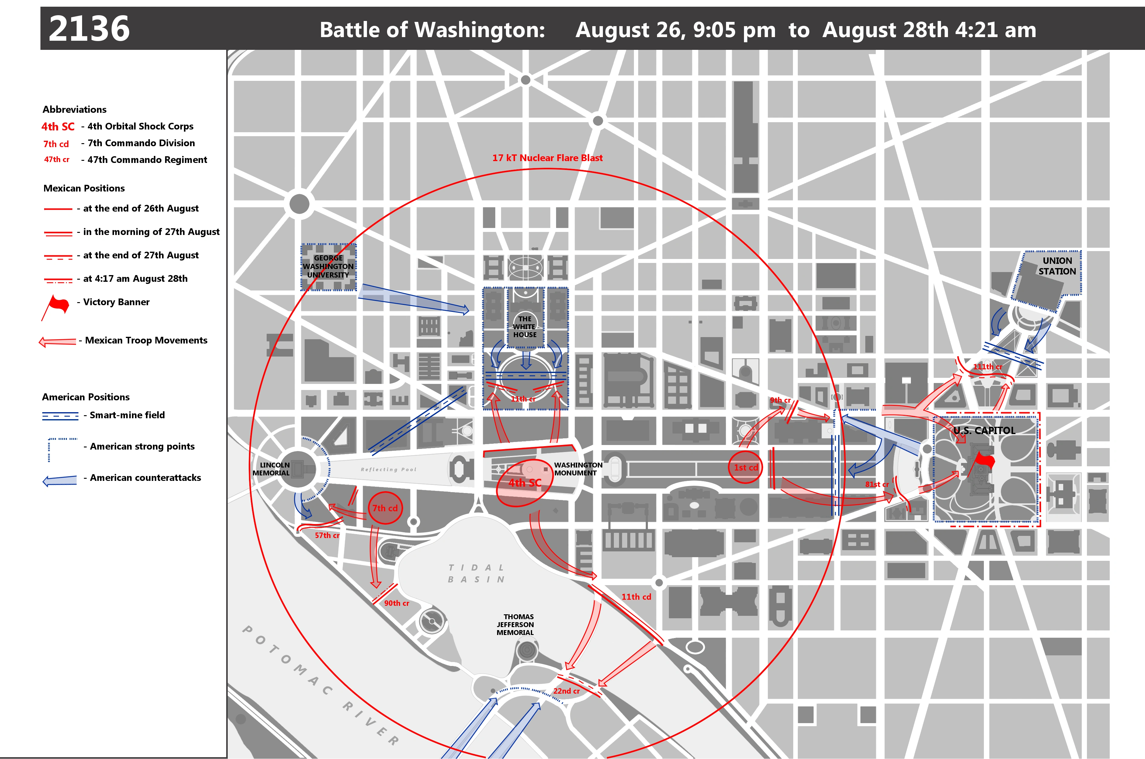 Mexico detected the fleet on August 24th, and on August 27th the colonial forces would reach Earth. Every simulation assured Mexico's leadership that the colonial fleet's forces would overwhelm them in short order, leaving Mexican war planners to prepare for the worst. Hoping to end the war before the first wave of the fleet arrived, Mexico launched a daring attack of its own on the US capitol of Washington D.C., detonating a nuclear flare above the city and invading in force on August 26th. President Halvidar, while in the White House bunker, ordered all available US forces and armed personnel to defend the city, and took the field in to directly oversee the defense of the nationโ€™s capital, the first President to do so since James Madison. Halvidar donned the armor he wore during the Guardiola Incident and coordinated forces in DC from the ruins of the White House, which was converted into a Forward Operating Base. While Halvidar intended to stand in defense of the city, he ordered Vice President Cora Fabian, who was campaigning for Halvidar's re-election in New York, to remaine out of the city in the event that he should fall. The Battle of Washington was the bloodiest the war had yet seen, with house to house fighting and open field warfare on the National Mall generating casualties in the thousands. For 31 hours the Mexican forces attempted to take the Capitol, until the colony fleet arrived on August 28th at 4:21 am EST.